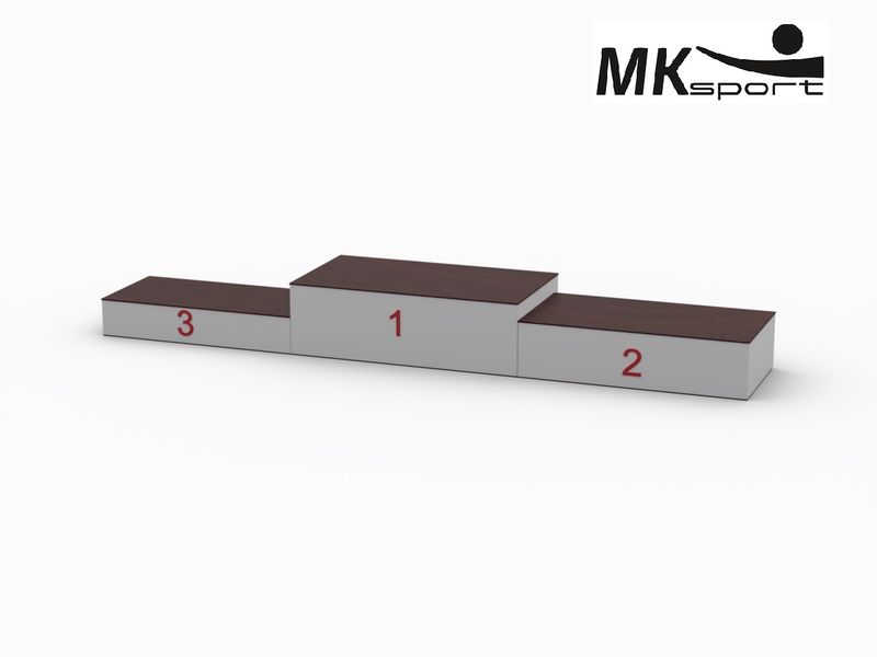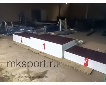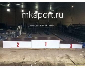 Пьедестал предназначен для награждения команд победителей из нескольких человек. Каркас подиума выполнен из профильных труб 40*40*2 и 40*25*2 мм, по кругу обшит стальным листом 1-1,5 мм. Настил ступеней – влагостойкая ламинированная фанера 9 мм с антискользящим покрытием. Маркировка пьедестала выполнена из самоклеящейся ПВХ пленки красного цвета. Стандартный цвет подиума белый.