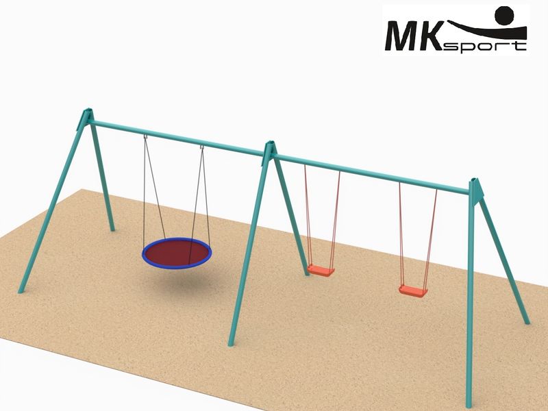 Каркас для качелей состоит из двух отсеков: один оборудован креплениями для размещения качели с широким сиденьем типа “гнездо”, другой может быть использован для монтажа двух классических качелей. Главное преимущество двойных качелей состоит в том, что одновременно кататься на них могут несколько человек. Для крупных спортивных площадок и дворов многоквартирных домов это как раз то, что нужно. Каркас качелей изготовлен из стальной трубы 76*3 мм. Все элементы надежно сварены, сварные швы зачищены. Стандартный цвет каркаса бирюзовый. Качели приобретаются отдельно.