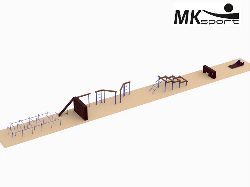 Укомплектованная всеми необходимыми элементами одиночная полоса препятствий типа “Атака” для школьников. Комплектация включает следующие элементы: лабиринт, забор с наклонной доской, разрушенный мост, разрушенная лестница, стенка с двумя проломами и одиночный окоп. Элементы изготовлены из профильных труб 80*80*3, 60*30*2, 40*40*2, 40*25*2, 42*3, 32*3 мм. Материал обшивки снарядов – влагостойкая ламинированная фанера 9 мм. Крепление опор к брусьям осуществляется с помощью уголков 63*63*5 мм. Стандартный цвет каркаса синий.