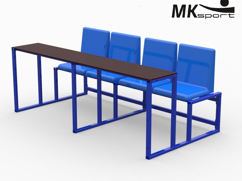 Скамейка со столом для судей на 4 места. Металлокаркас скамьи изготовлен из профильной трубы 40*25*2мм. Сидения пластиковые. Материал покрытия столешницы – влагостойкая ламинированная фанера 9мм. Покраска полимерная порошковая с предварительной покраской цинкосодержащим грунтом, цвет синий.