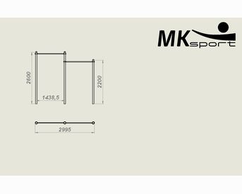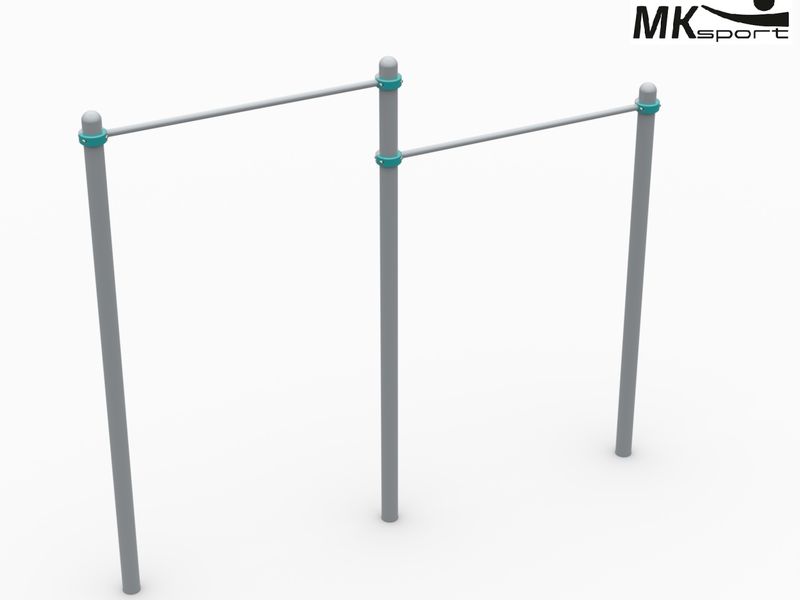 Универсальный снаряд для тренировок на свежем воздухе. Используется для выполнения упражнений подтягивания и подъема ног в висе. Турник может быть использован одновременно двумя спортсменами. Перекладины фиксируются на разной высоте, что обеспечивает удобство тренировок людям разного роста. Основные столбы изготовлены из круглой трубы 89*3 мм, перекладины выполнены из труб 32*3 мм и фиксируются к столбам с помощью стальных хомутов. Каркас изделия окрашен в серый цвет, хомуты бирюзовые.