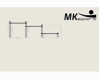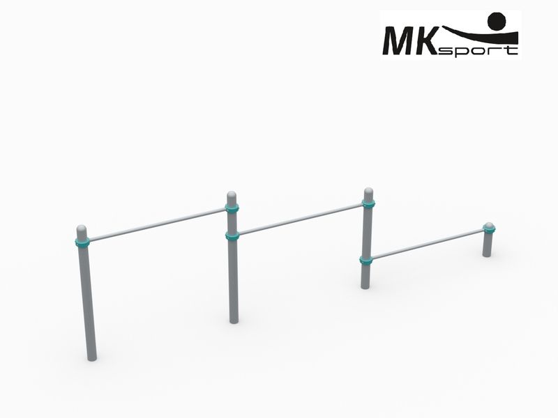 Уличный снаряд для выполнения отжиманий и упрощенного варианта подтягиваний. Конструкция состоит из трех перекладин, установленных на разной высоте. Благодаря этому на каскаде могут заниматься люди с разным уровнем физической подготовки любых возрастов. Комплекс состоит из четырех опорных столбов, изготовленных из стальных труб 89*3 мм, а также трех перекладин, диаметром 32 мм. Для фиксации элементов используются стальные хомуты. Основной цвет снаряда серый, хомуты бирюзовые.