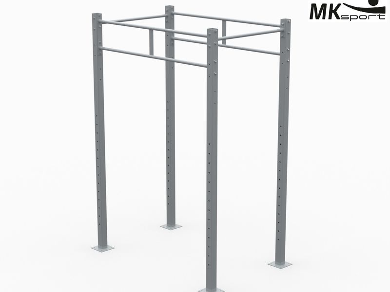 Наиболее простой вариант свободностоящего кроссфит комплекса. Но он не уступает по функциональности более крупным снарядам. Различие лишь одно: тренироваться на нем могут одновременно максимум 4 человека. Конструкция предполагает 4 рабочие зоны: две для выполнения упражнений со штангой, две для подтягиваний и других элементов кроссфита, выполняемых на перекладинах. Опорные столбы имеют перфорацию для фиксации на них кронштейнов для штанги и страховочных упоров. Сверху столбы закрыты заглушками.