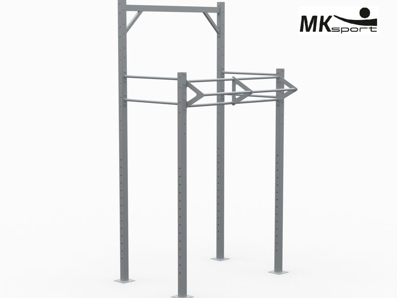 Данный комплекс включает все самые необходимые для кроссфит тренировок элементы: зону для упражнений со штангой, зону для подтягиваний и других элементов кроссфита, выполняемых на перекладине, зону для подвешивания дополнительных снарядов (колец, канатов). При этом комплекс отличается компактностью и универсальностью: установить его можно в спортзале или на открытой площадке, монтировав в бетонный пол или резиновое покрытие. Опорные столбы по всей высоте имеют отверстия: установить штангу и страховочные упоры можно на любой высоте.